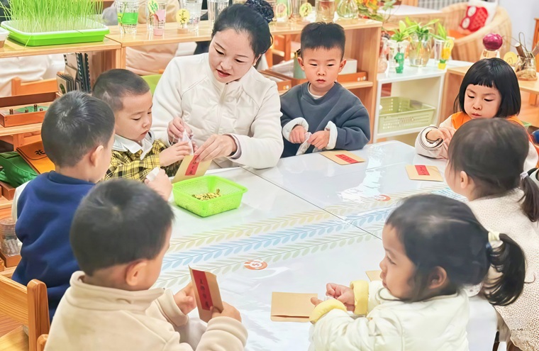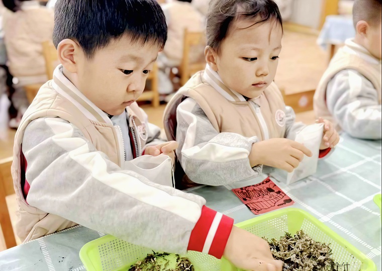 中班孩子和老師一起識(shí)別艾葉、紅花等中藥材,親手制作愛(ài)心足浴包,小小的藥包承載的是孩子們對(duì)祖輩健康最樸實(shí)的祝愿。晚間回家,孩子們用自制的足浴包為爺爺奶奶泡腳、捶背,讓歲月的辛勞在揉捏間悄然消融,實(shí)踐著“你陪我長(zhǎng)大,我陪你變老”的暖心承諾。