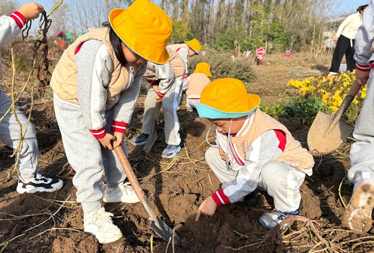 來到田趣苑,地面上的藤蔓早已被清理干凈,露出了松軟的土地,仿佛在向孩子們發(fā)出邀請。老師示范用小鏟子輕輕刨開泥土:“大家注意看,土面下有細細的根須,順著根須挖,就能找到紅薯啦!”孩子們立刻行動起來。大家兩兩一組,有的專注鏟土,幼兒細心觀察,當(dāng)一抹紅色從泥土中露出,孩子們便爆發(fā)出一陣驚呼——找到了!孩子們小心翼翼地扒開泥土,合力將紅薯拔出放進筐子,泥土沾上衣衫,笑容卻格外燦爛。不一會兒,筐中已是碩果累累,田埂間回蕩著合作的喜悅與收獲的滿足。