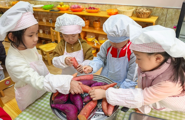 帶著沉甸甸的收獲回到幼兒園,孩子們又化身“小廚師”,投入到新一輪的忙碌。“紅薯身上還有泥土,我們先把它們洗干凈吧!”大家圍在水池邊,挽起袖子,認真地搓洗著紅薯。洗好的紅薯被分成兩撥:一部分放進烤箱,另一部分則被切成均勻的小塊進行晾曬,“這些要曬成紅薯干,肯定特別有嚼勁!”孩子們一邊忙活一邊期待。當(dāng)烤箱里的紅薯飄出焦香,他們品嘗著自己的勞動成果,那滋味,格外香甜!