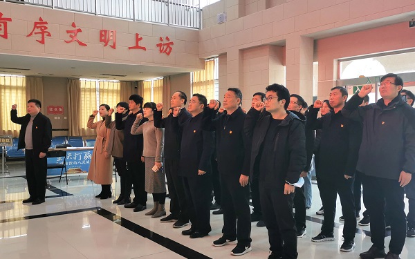 9點整,漯河市信訪局全體干部職工齊聚信訪接待大廳,鄭重地舉起右手,莊嚴地進行《憲法》宣誓。